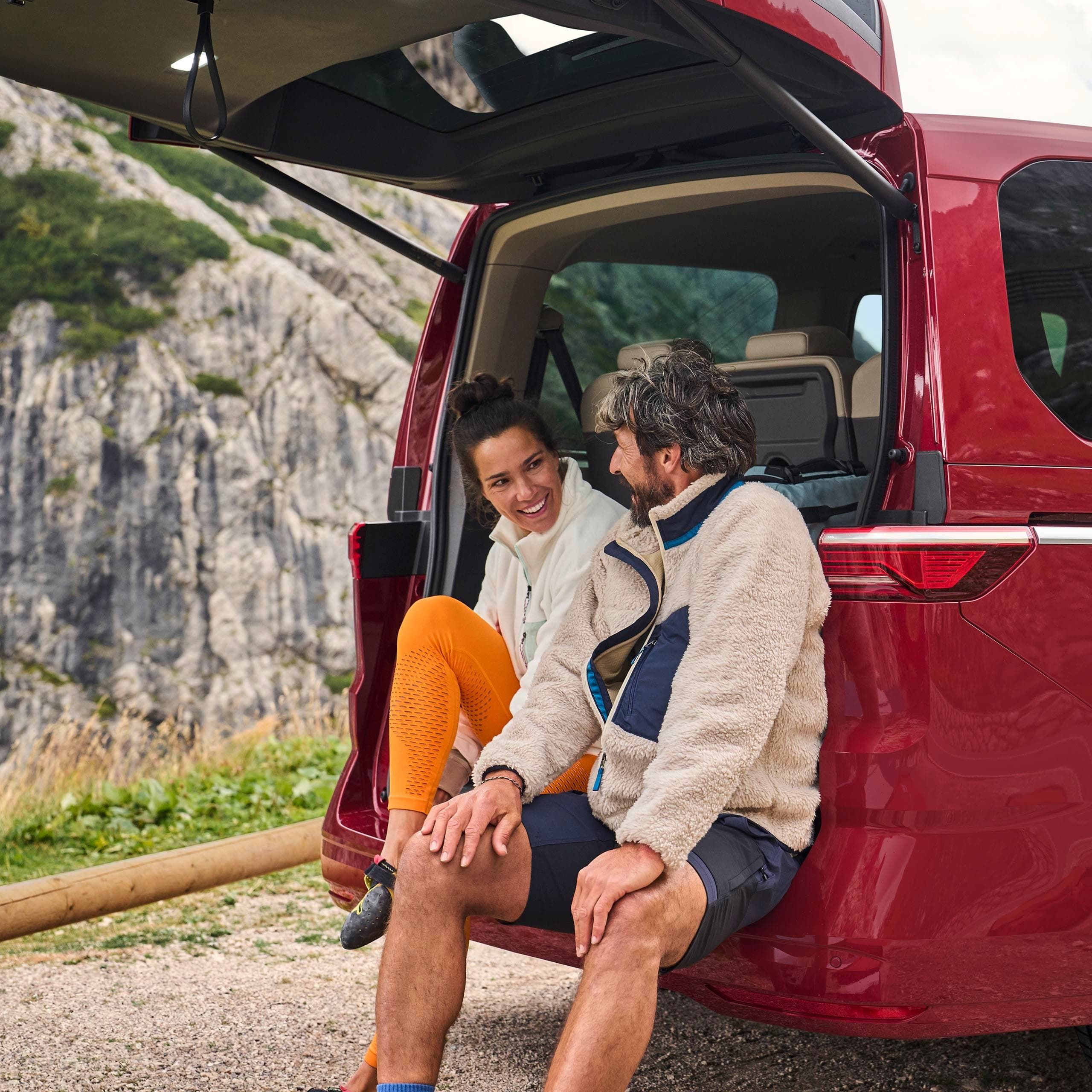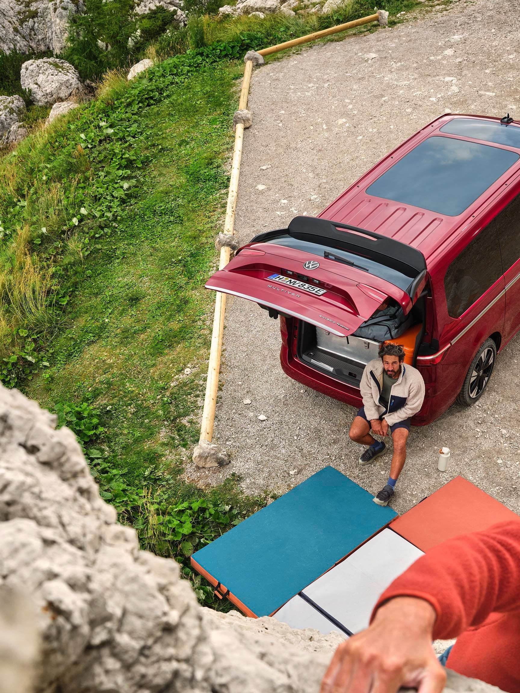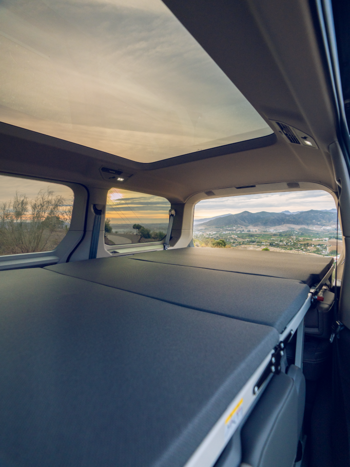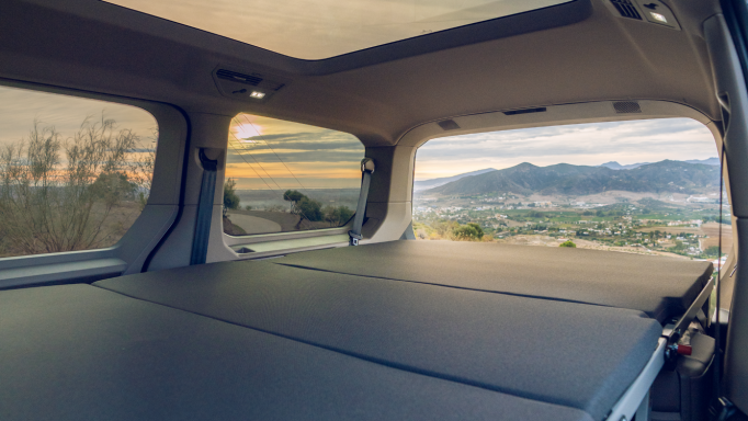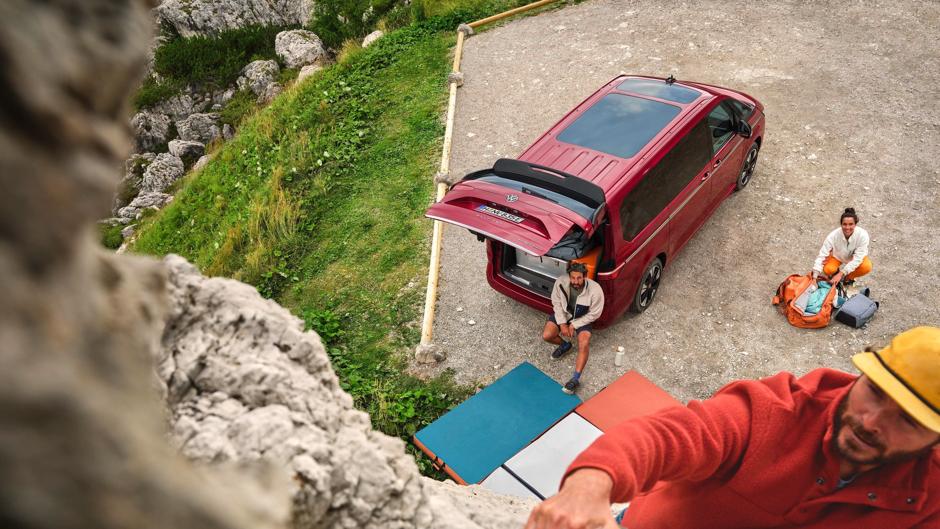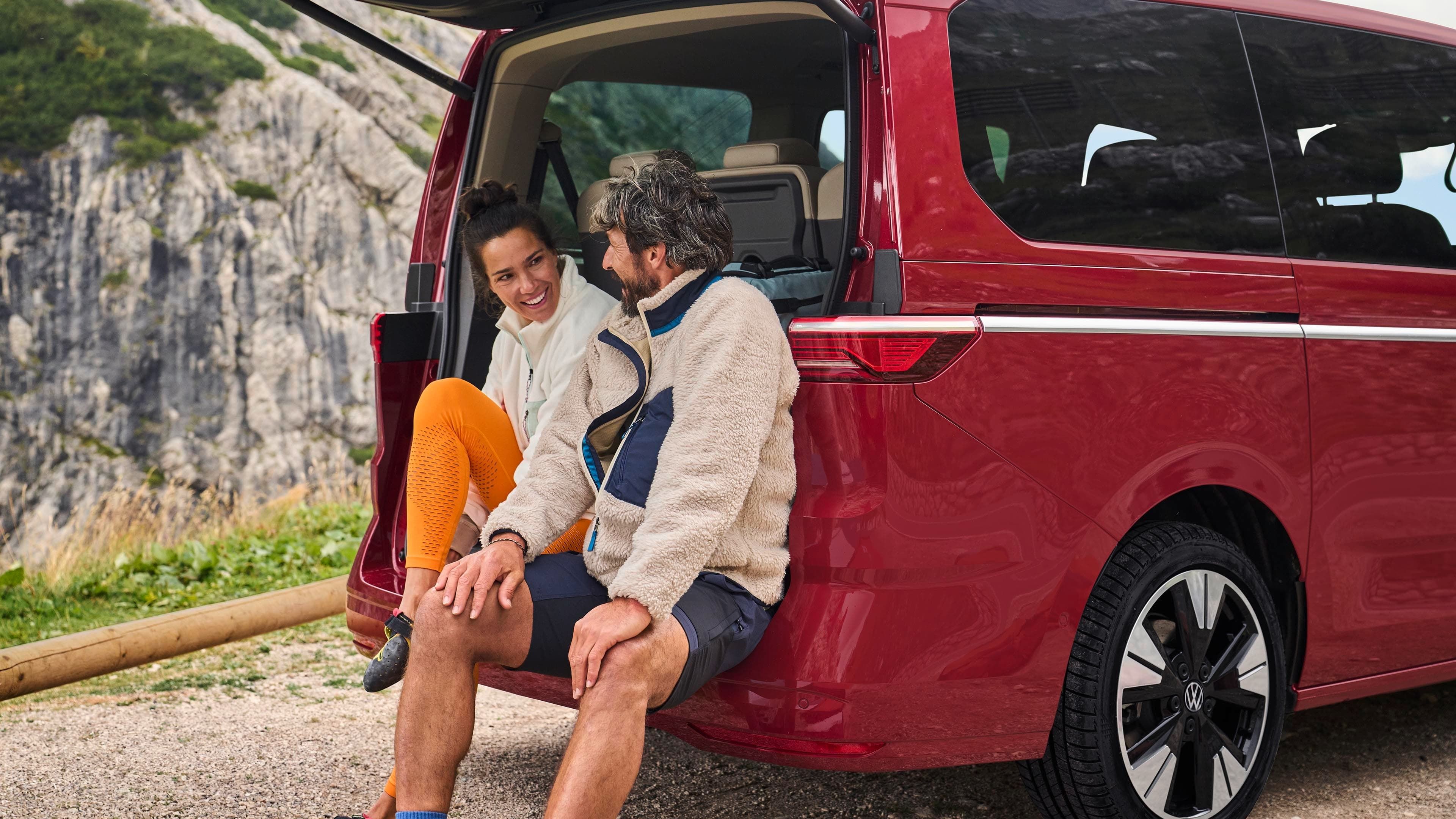 Na Multivan, pode sentir-se tão confortável na cidade como na autoestrada. Independentemente de escolher a versão curta (4,98 m) ou longa (5,18 m): ambos os modelos são suficientemente baixos para parques de estacionamento comuns, mas suficientemente altos por dentro para tornar as suas férias uma experiência relaxante. O grande teto panorâmico inclinável6, com 1,83 m2, é uma inovação absoluta. Aumenta a altura do habitáculo em mais 34 mm. Agora é ainda mais fácil carregar e subir para o veículo. Tanto as portas deslizantes elétricas7 como a tampa traseira eletricamente acionada8 podem ser abertas por meio de um gesto do pé - sem retirar a chave do bolso. Os sistemas «Keyless Advanced»9 e «Easy Open»10 tornam isso possível.