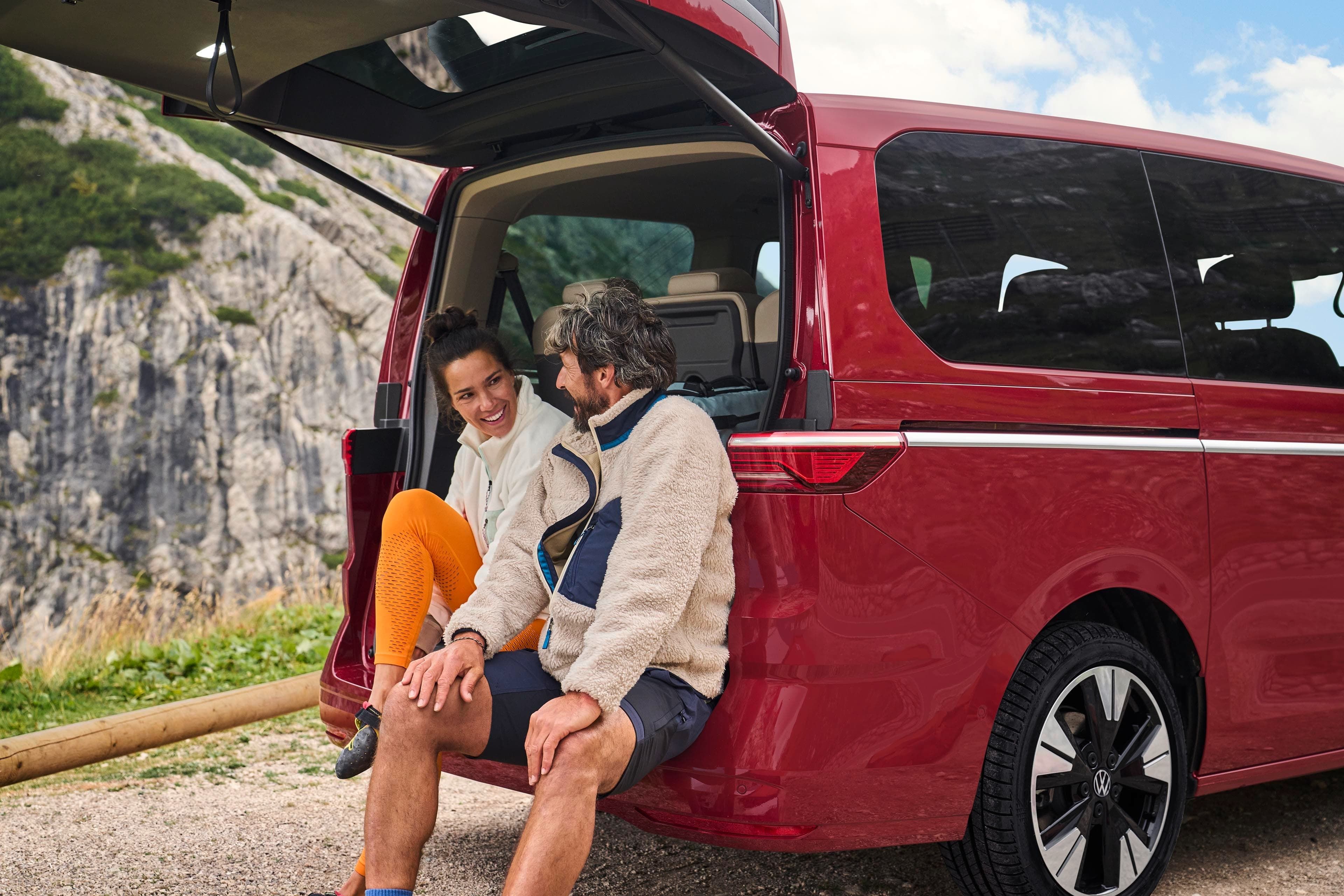 Na Multivan, pode sentir-se tão confortável na cidade como na autoestrada. Independentemente de escolher a versão curta (4,98 m) ou longa (5,18 m): ambos os modelos são suficientemente baixos para parques de estacionamento comuns, mas suficientemente altos por dentro para tornar as suas férias uma experiência relaxante. O grande teto panorâmico inclinável6, com 1,83 m2, é uma inovação absoluta. Aumenta a altura do habitáculo em mais 34 mm. Agora é ainda mais fácil carregar e subir para o veículo. Tanto as portas deslizantes elétricas7 como a tampa traseira eletricamente acionada8 podem ser abertas por meio de um gesto do pé - sem retirar a chave do bolso. Os sistemas «Keyless Advanced»9 e «Easy Open»10 tornam isso possível.