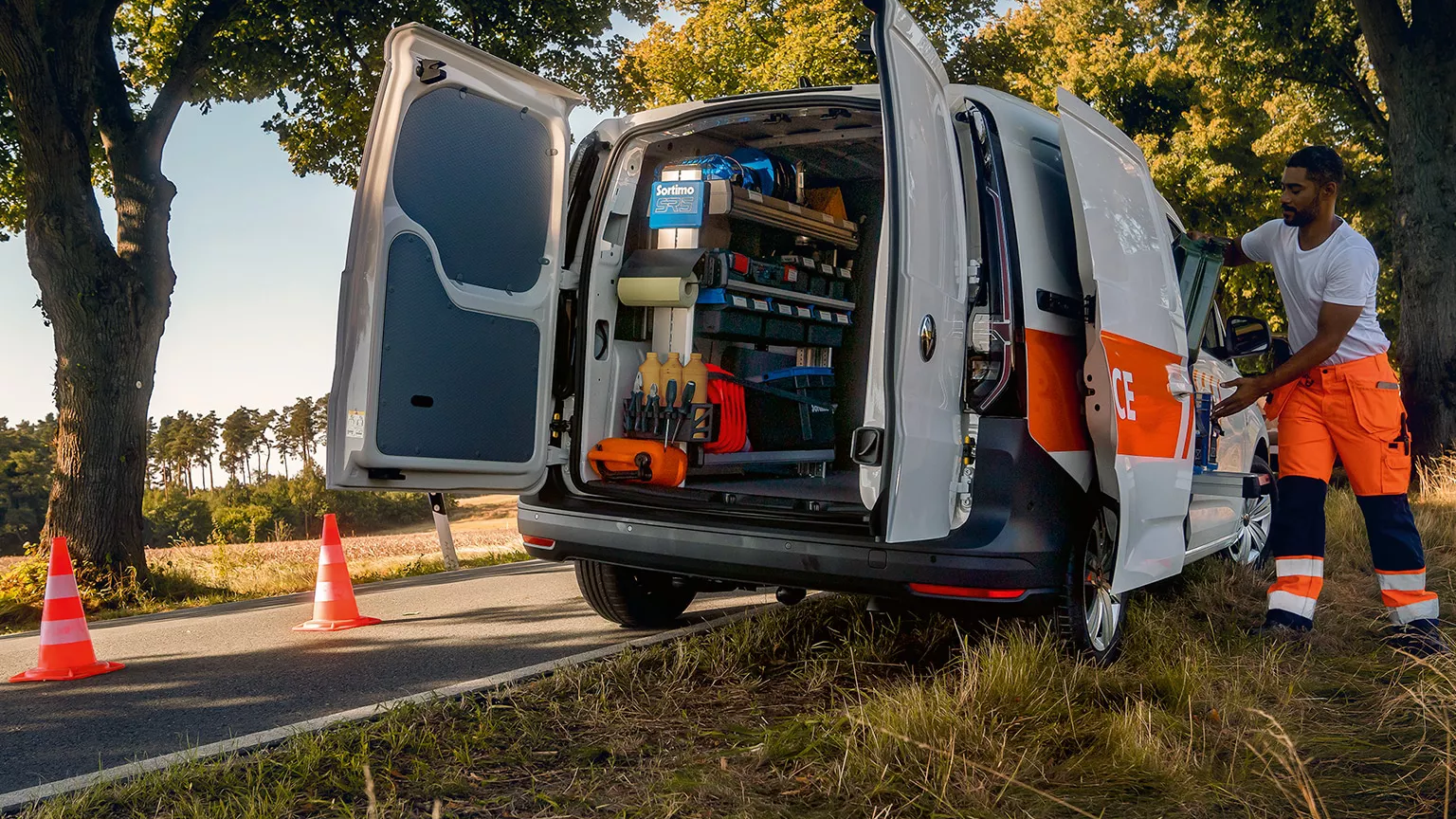 O compartimento de carga do Caddy Cargo está preparado para quase tudo. Desde as portas de batente em chapa, particularmente resistentes, passando pelos revestimentos robustos para o piso e pelos até 100 kg de material adicional que pode transportar no tejadilho. Além disso, estão disponíveis inúmeras opções de equipamento especial, desde as divisórias até ao moderno Digital Cockpit.