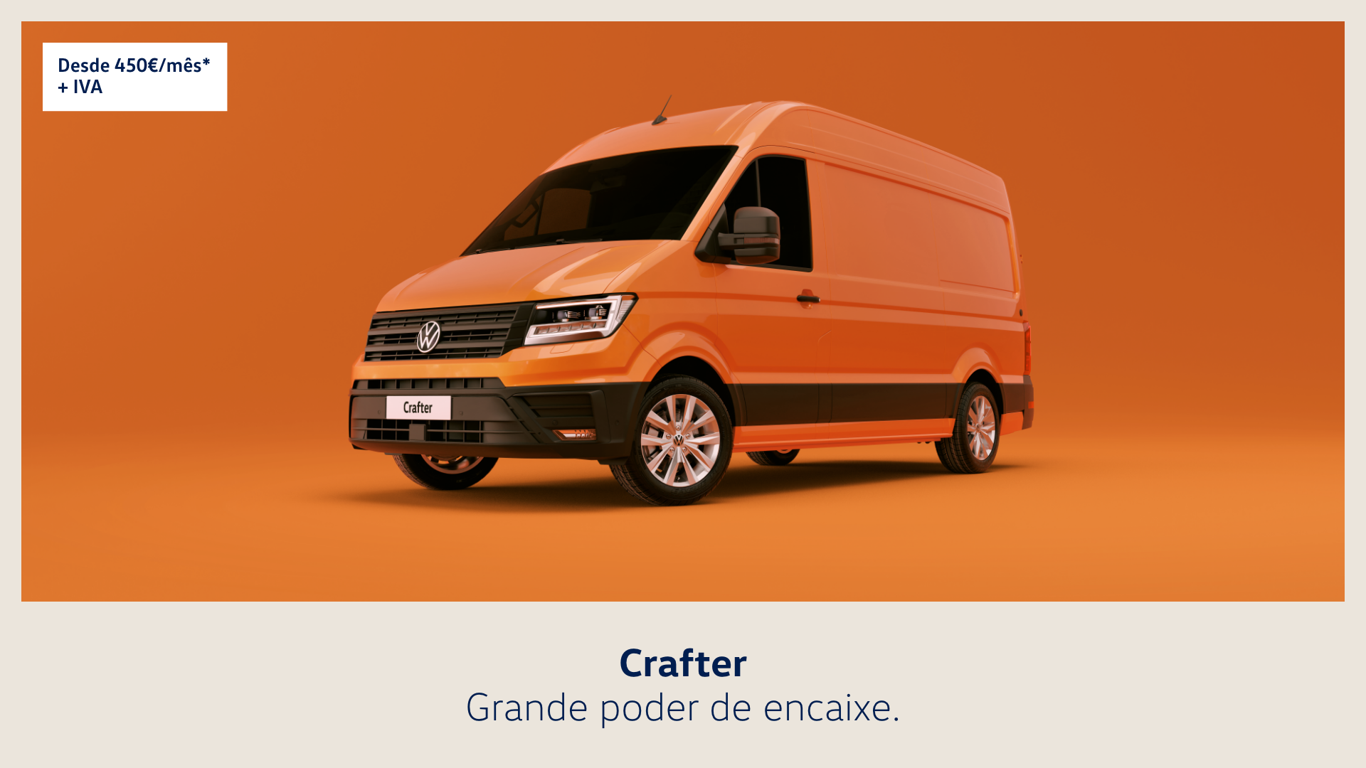 3Campanha em Renting (Aluguer Operacional) para Volkswagen Crafter 35 Cargo L3H2 2.0TDI. Sem entrada inicial. Contrato para 60 meses e 100.000 Kms através da marca registada e licenciada Volkswagen Financial Services, comercializado pela Volkswagen Renting Unipessoal, Lda. Despesas no valor de 125€. Inclui manutenção completa, IUC, IPO, assistência em viagem, linha de apoio ao condutor 24 horas, viatura de substituição económico e seguro de avarias. Campanha válida para empresas até 31/12/2025.Limitado ao stock existente. Imagem não contratual. Dados de Consumo de Combustível e Emissões de CO2 para o veículo Crafter 35 Cargo L3H2 2.0TDI, Consumo de combustível: 8,4 L/100 km e Emissões CO2 (Ciclo Combinado WLTP): 222 g/km.